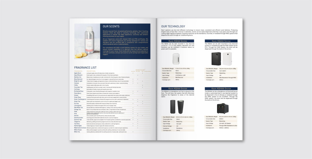 Brochure design for Kaori Home, a scent marketing company helping businesses create memorable brand experiences through fragrance. The layout blends calm visuals with clear messaging to reflect the sensory nature of their work.
