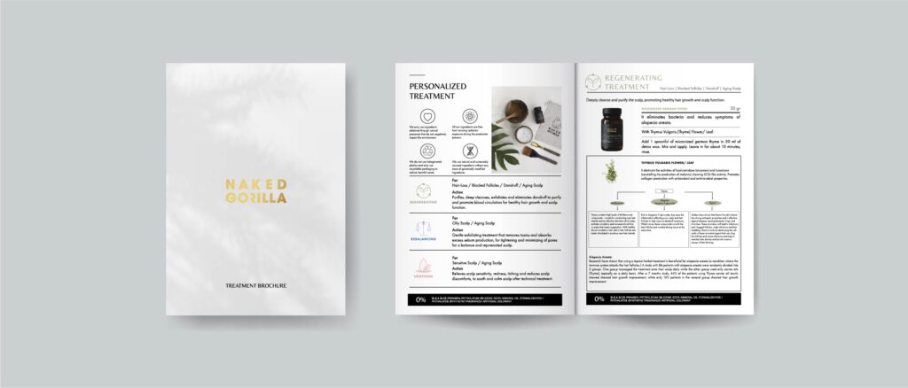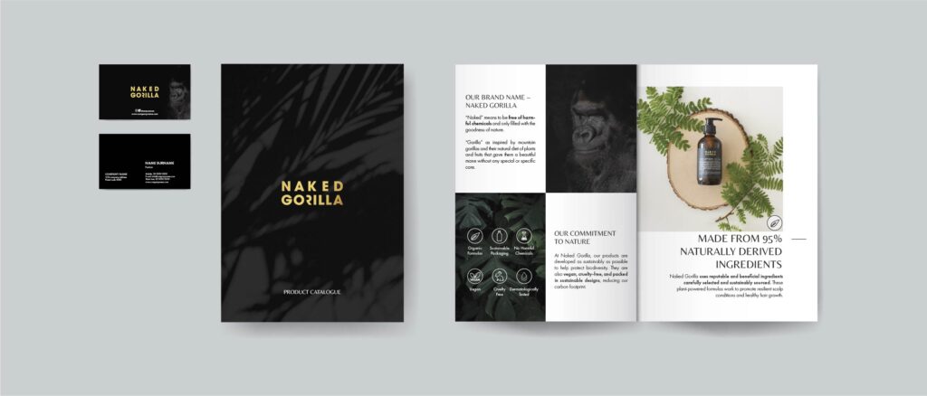 Product brochure design for Naked Gorilla, an organic hair care brand. The layout highlights product benefits, natural ingredients, and the brand’s bold visual identity in a clean, easy-to-navigate format.